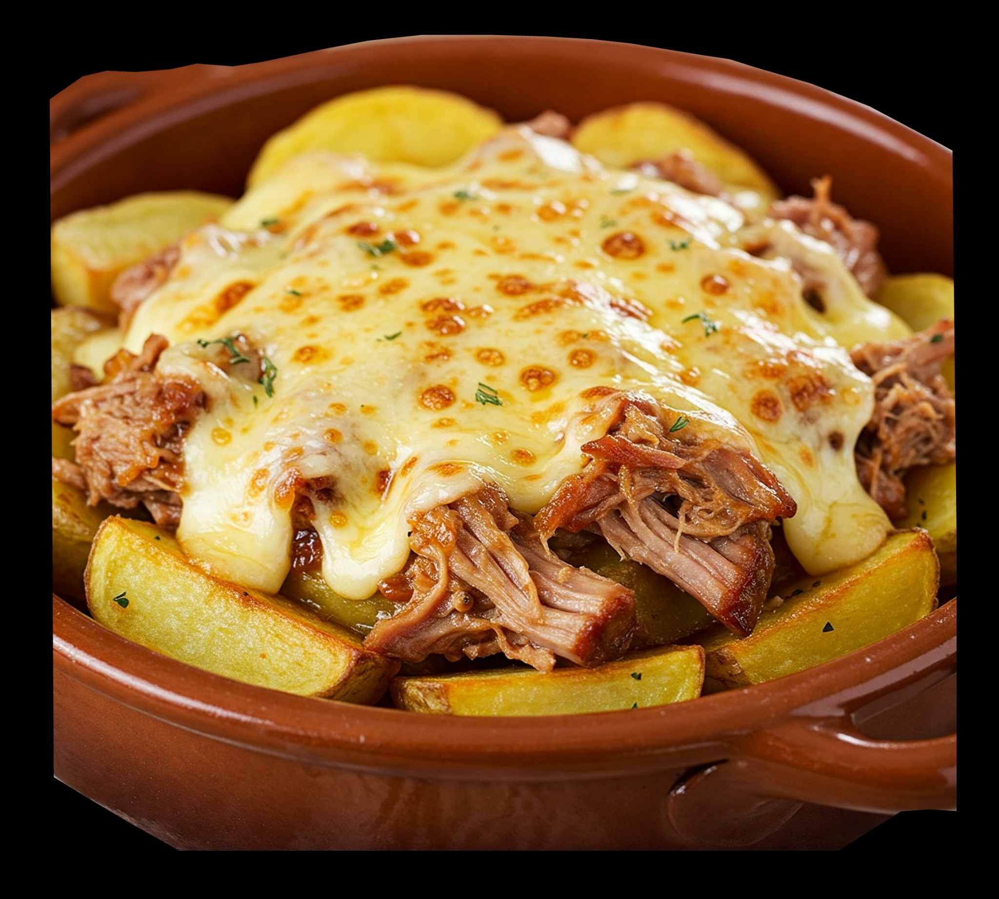 Patatas Deluxe, con Salsa de Queso, Pulled Pork o Pulled Chicken y dos tipos de queso para fundir incluyendo Cheddar Ahumado.