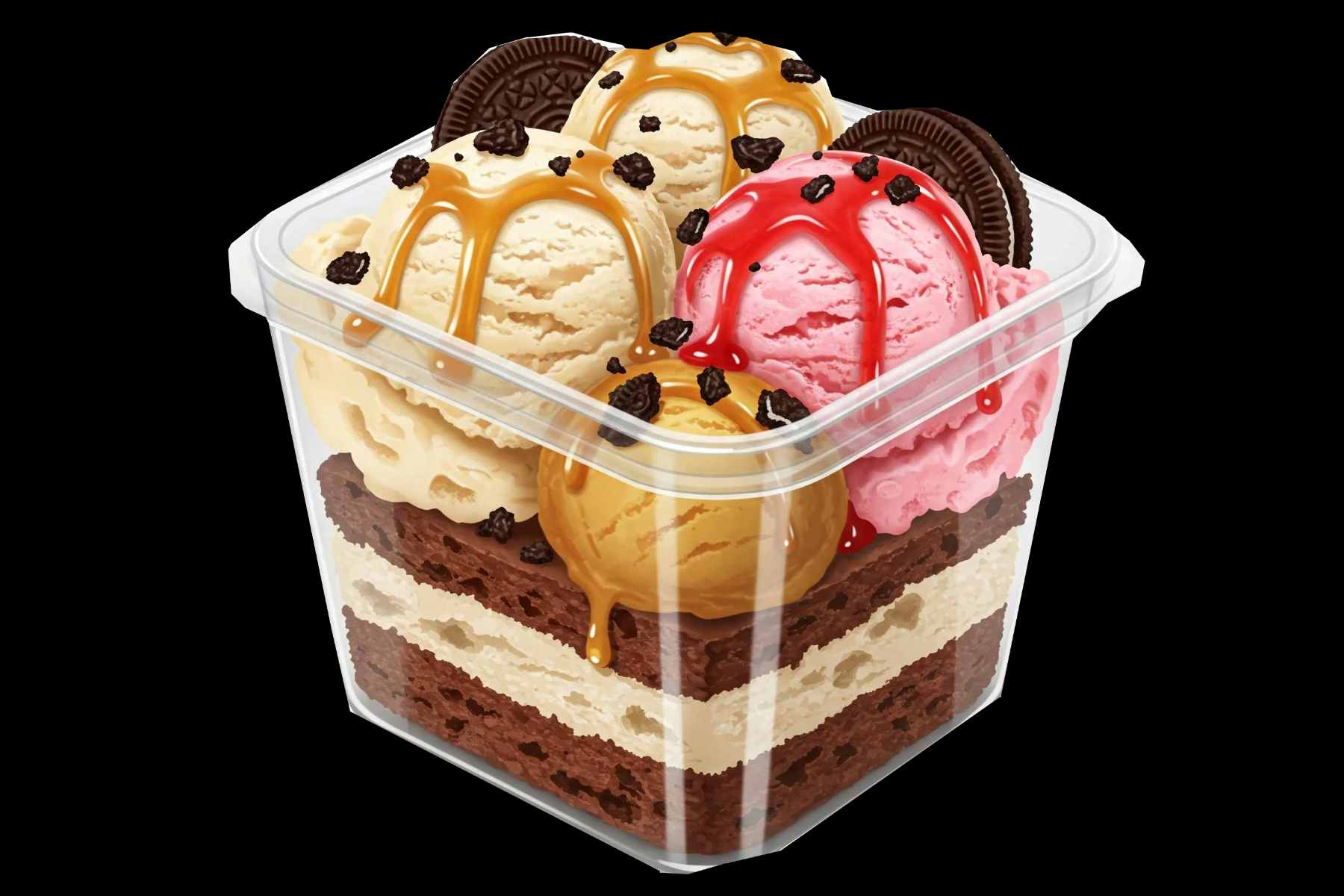 Una base con bizcocho de chocolate y vainilla con helado de vainilla y caramelo y helado de tarta de queso de fresa, coronado con trozos de galletas Oreo.